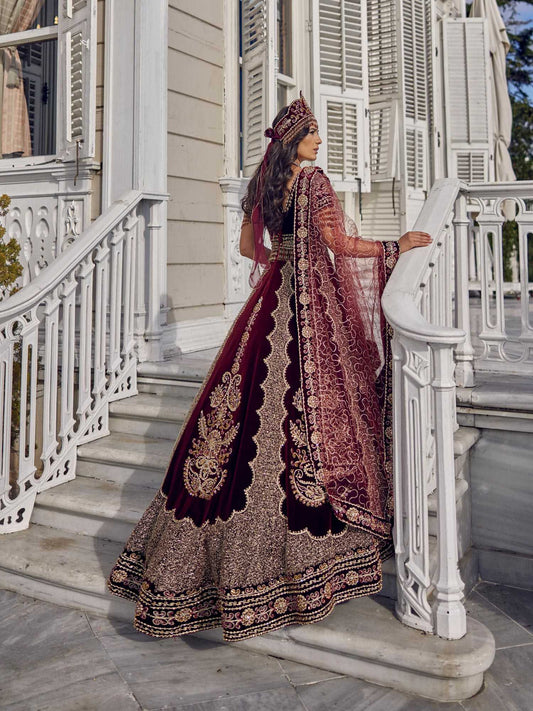 Burgundy Frill Sleeve Long Embroidery Sequin Henna Party Dress