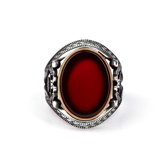 Double Headed Eagle Motif Red Agate Stone Silver Ring